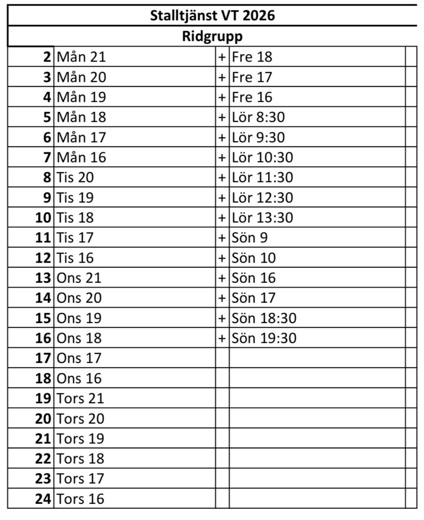 Detta schema finns även uppsatt i stallet.